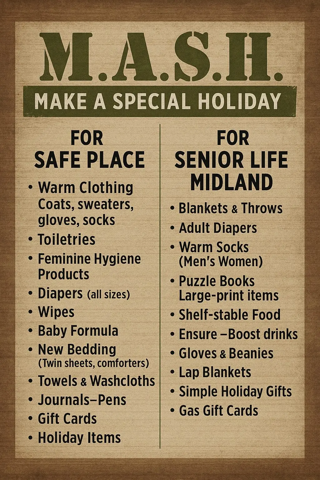 KICKS 99.1,  Safe Place Of The Permian Basin & Senior Life Midland along with CBD Way, 349 Liquor, Texas Dermatology & Soft Suds present M*A*S*H” ~~ Make A Special Holiday,  December 4 & 5 – 7am-7pm daily, at the Garfield Plaza Shopping Center at Loop 250 and Garfield.